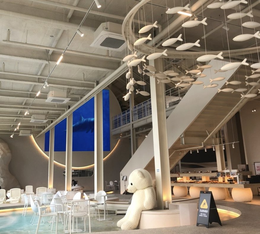 그리고 몬스터리움 바로 옆 카페수산공원은 요즘 핫플로도 많이 소개되는 장소인데요. 건물 외관부터 이색적인 구조로 되어있고, 실내 역시 쾌적한 바닷가를 연상시키는 인테리어에 개방감 느껴지는 대형카페로 한번씩 들려볼만한 곳이랍니다.