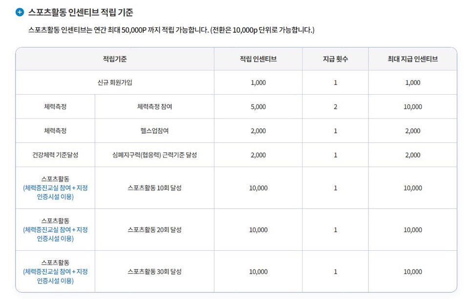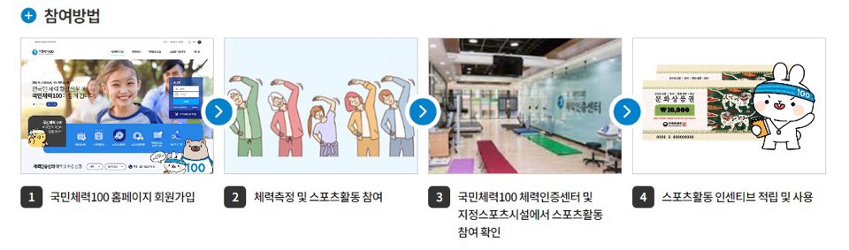 체력100 홈페이지 (https://nfa.kspo.or.kr/main.kspo) 회원가입 및 체력인증센터 방문 하여 체력측정 완료 후 헬스업, 스포츠활동 10회 참여 완료 시 스포츠활동 인센티브가 적립. 이 스포츠활동 인센티브 10,000P 이상 적립 시 문화상품권 10,000원권으로 교환 가능.
