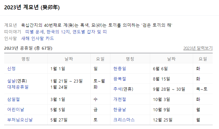 공휴일은 총 67일로 올해와 같다고 하네요.