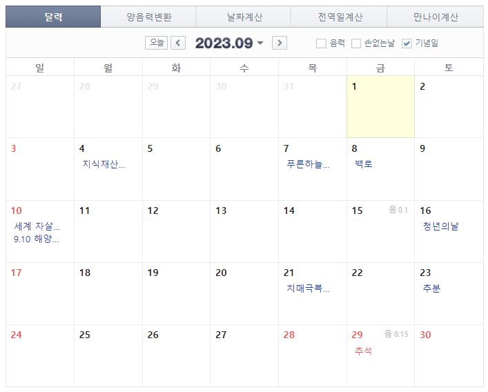 추석이 9/29 금요일로, 추석연휴는 이어지는 일요일까지 9/28~10/1 4일이 되겠네요.